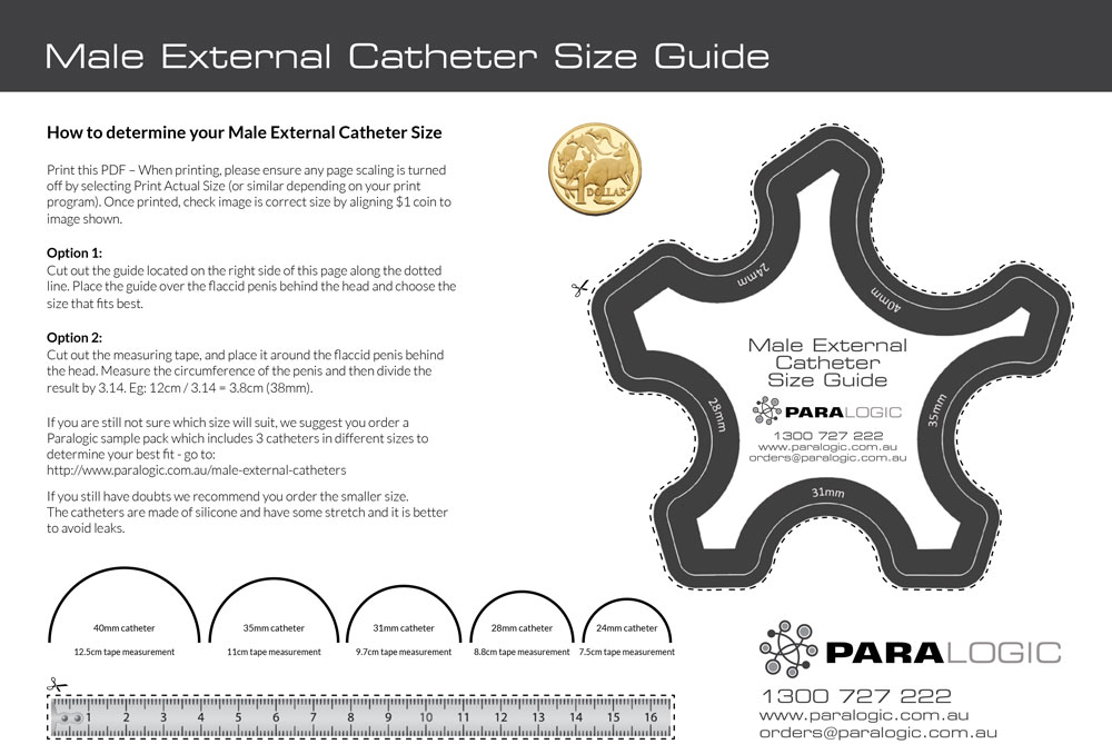 External male catheter, also known as a condom catheter. Can be attached to overnight or leg bags. Please review size using the PDF sizing guide link in the description to ensure the correct size.